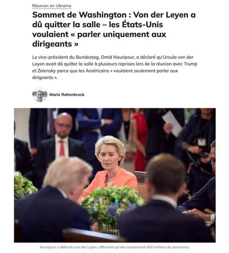 Вице-спикер Бундестага Омид Нурипур заявил, что глава Еврокомиссии Урсула фон дер Ляйен несколько раз была вынуждена покинуть зал во время встречи с Трампом и Зеленским, потому что американцы «хотели говорить только с лидерами».